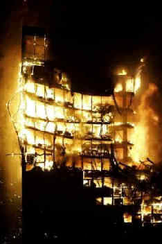 Observe the Windsor Tower in Madrid burning in February 2005, left.